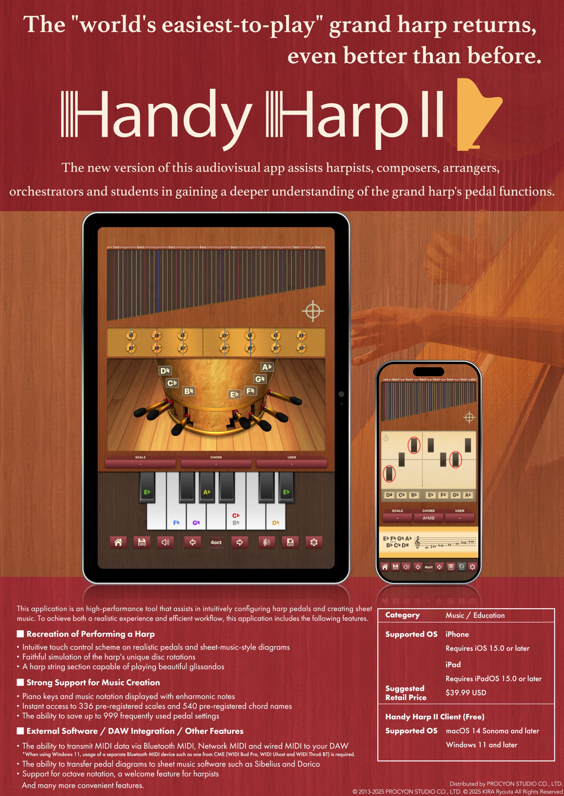 今日は少し嬉しいご報告があります。その昔、iPhone・iPad向けにハープ専用アプリ「Handy Harp」を販売していましたが、諸事情により一度は販売を終了していました。しかしその後も「また使いたい」という声を多くの方からいただき、このたび大幅なアップデートを施した「Handy Harp II」を復活させることにしました。本日から購入可能です。特徴やアップデートされた内容は下記のパンフレットをご覧になっていただけたらと思います。デモ曲のモックアップを作るとき、ハープの打ち込みって本当に骨が折れる作業ですよね。皆さんはどうやって打ち込んでいますか? とりあえず白鍵でハープっぽく演奏して、あとから一音ずつ調整しますか?それとも、最初からハープ音源に入っている「それっぽい」グリスサンドの音を選んで済ませてしまっていますか? 正直に言うと、自分にとってもハープの打ち込みは「最もやりたくない打ち込み」のひとつでした。ただ、このアプリがあれば、自分がイメージしたハープをほぼ一瞬で打ち込むことができます。アプリとDAWを連動させて、曲に合わせて演奏するだけです。しかも、そのまま譜面ソフトにペダルダイアグラムを転送することも可能です。ハープは、グリッサンド一つとっても本来いろいろな考え方があります。「面倒だから」と、ありきたりなペダリングで済ませてしまうのは、どこか違う気がしていました。同じような悩みを抱えている作曲家、編曲家、オーケストレーターの方には、ぜひ一度使ってみていただきたいです。そして、今回ハーピストの方にも使っていただきたい機能があります。それは、ペダル変更箇所を丸印でわかりやすく示す「変更可視化機能」です。レコーディングスタジオなどで、譜面をもらい、限られた時間でペダルの確認をしなければいけません。この機能があれば譜面をさらいながら、変化させなければいけないペダルが一目瞭然ですし、次に出てくるハープダイアグラムが本当に合っているのかなどの確認も出来るためミスを最小限におさえられます。また、あまりコードのことを分からない方にもプリセットが沢山用意されていますので、試してみることもできます。自分が欲しかった機能をとにかく入れ込みました。そしてハーピストである朝川氏とプログラマーの雲英氏、グラフィッカーの對馬氏と、UI、操作性など、とことん拘って使い勝手のよいアプリを目指しました。ハープについて同じ悩みを抱えていた方がいらっしゃれば、是非、使ってみていただきたいと思います。ハープは音楽全体を(特にオーケストラでは)豊かにしてくれる楽器です。是非、これを期にハープに対しての考え方を見つめ直していただけたらと思います。また、アプリについて率直なご意見などあればお待ちしております。